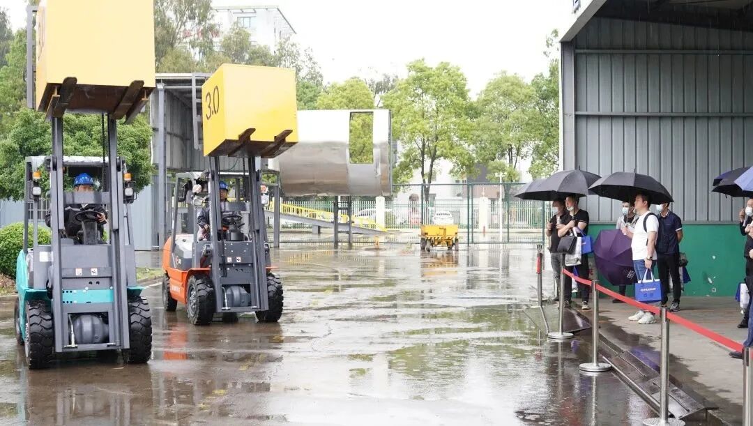 为了让来访嘉宾对油车和电车有更直观的区分,由吉鑫祥技术人员驾驶新能源叉车,向大家展示新能源叉车与内燃叉车的不同。通过现场演示,能看出电车更轻盈便捷,耗能更少,低噪声、低排放等优点。
